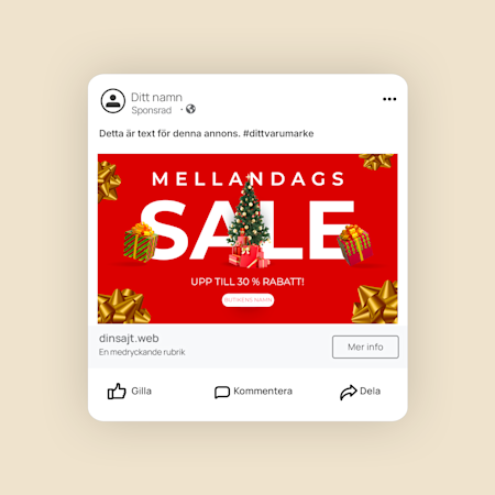 Alla mallar har en bild eller grafik med en eller flera textrutor, och alla kan enkelt anpassas till ditt varumärke. Du kan också lägga upp egna bilder eller foton och lägga till text och grafik med vårt redigeringsverktyg. Många använder våra mallar till rea och profilprodukter, lediga tjänster, för att visa upp varor, berätta om varumärket och vad kunderna säger, men du har säkert fler bra idéer!