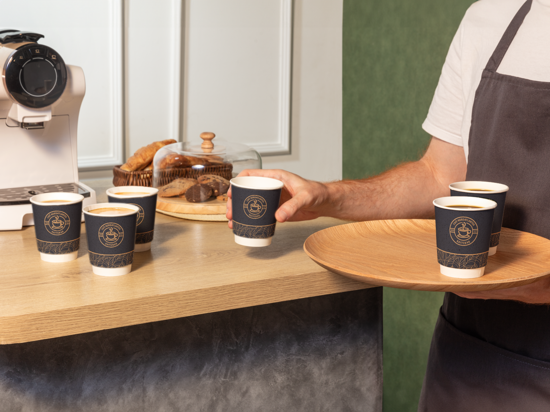 Se till att folk ser din logotyp med takeaway-muggar som går att återvinna eller kompostera och som fångar varumärkets själ.