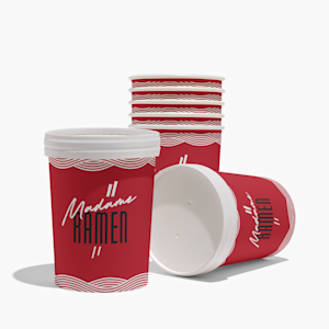Våra pappmuggar för soppa har en vattenbaserad beläggning som vätskebarriär. Våra PE-bestrukna muggar har polyetenbestruken insida.
