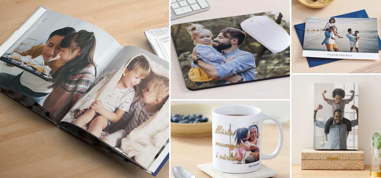 En fotobok är ett utmärkt sätt att förvandla mammas eller pappas digitala favoritfoton till en konkret och modern variant av det klassiska fotoalbumet. En specialdesignad fotobok kan fås i många olika storlekar, layouter och former, och kommer att passa mycket bra på mottagarens soffbord eller i bokhyllan. Se till att ha med foton på dina globetrottande föräldrars favoritplatser och återblickar från gamla familjesemestrar. Med färggranna ramar, clipart och symboler kan du snabbt sätta en personlig prägel på varje sida, och med textrutor är det enkelt att lägga till ett gulligt meddelande eller anteckna datumet för varje foto.