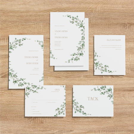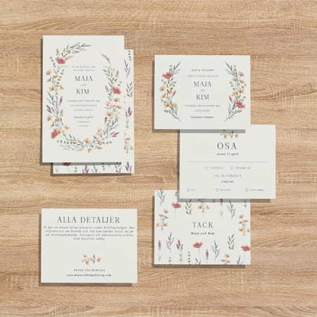 Den klassiska kombinationen är spara datumet-kort, bröllopsinbjudan och OSA-kort eller bilagor. Om ni vill ge gästerna möjlighet att svara digitalt går det bra att lägga till en QR-kod på inbjudan som länkar direkt till er bröllopshemsida.