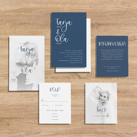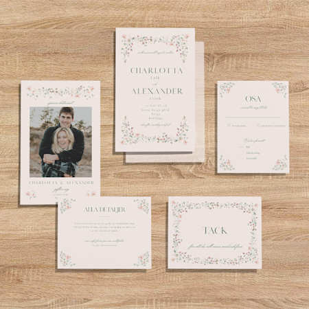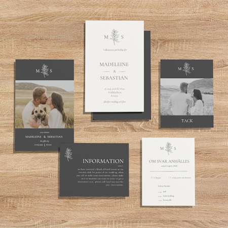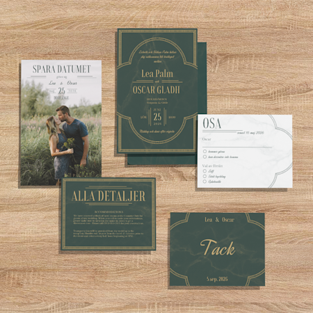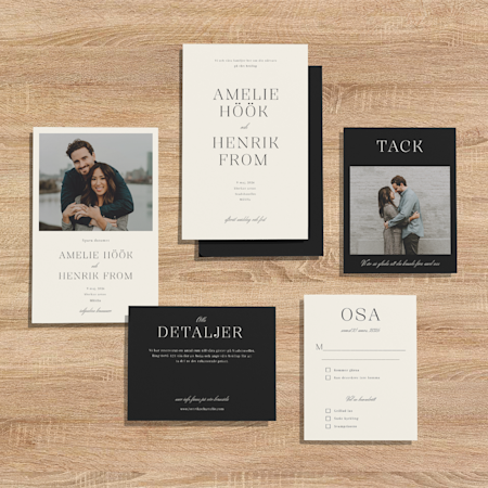 Börja med att bläddra bland inbjudningskorten. Hitta en mall ni vill ha och anpassa den med datum, plats, information om mottagningen med mera. Ni kan den överföra samma design till resten av bröllopsprodukterna, till exempel OSA-kort och bilagor. Eller kontakta vårt team – om ni har en mall ni älskar kan de ta fram alla matchande produkter och skapa en komplett uppsättning bröllopsprodukter. Är ni ute efter något lite mer eklektiskt? Var inte rädda att mixa och matcha viktiga delar för en rolig och modern stil.