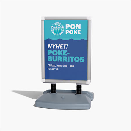 Om du riskerar starka vindar och regn rekommenderar vi våra gatupratare för bästa stabilitet. De kan fyllas med upp till 17 l sand eller vatten och klarar även blåsiga miljöer, upp till 25 m/s, och ramen i stål och aluminium ger utmärkt skydd till skyltarna.
