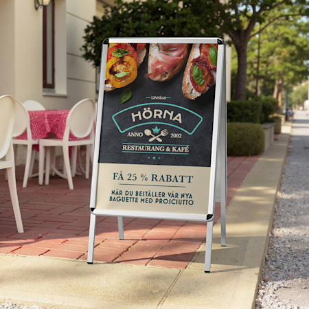 Våra skyltar för utebruk är framställda av vind- och vädertåliga material som klarar lite mer – och är lite mer färgglada – och de får folk att lägga märke till food trucks, uteserveringar, gatumarknader, parkeringar med mera. Välj bara den skylt och mall du vill specialdesigna och ladda sedan upp designen, eller välj någon ur vårt stora bibliotek. Vårt team med expertdesigner, och vårt kundserviceteam, finns här och kan hjälpa dig om du behöver. Din produkt trycks med färgtryck och levereras snabbt så att du omgående kan börja få ut budskapet.